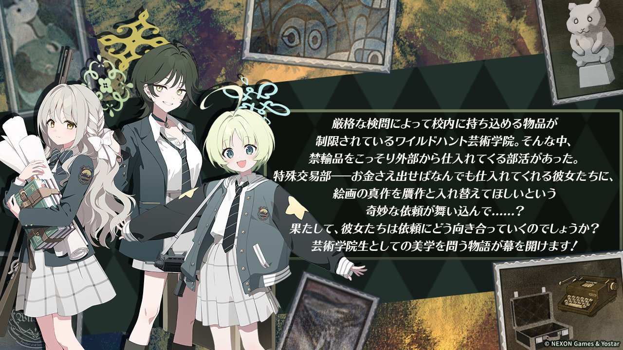 見知らぬ部屋で目覚めた先生。目の前にいたのはワイルドハントの生徒、桜井ミヨだった。彼女は校則違反の物品運びを請け負う「特殊交易部」を廃部にしたいと先生に悩みを打ち明ける。まずは、部長との面会を求めた先生だったが……ミヨは気まずそうに、自分がその部長だと告白するのだった。
