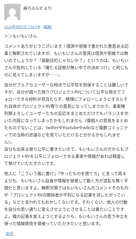 長いので内容を掻い摘んで、「手前の意見は憶測じゃねぇのか」「公平性に欠けると思うなら手前から公平と思う情報を出せ」「他人に指図するくらいなら手前で書け」と返信したんですが、未だにプロジェクトKV(ディナミス・ワン)についてフォローできる情報をもいもいさんからいただけておりません!この1年で何1つ彼らを擁護できるポイントが見つからなかったということでしょうか!このままだと根拠の無い憶測で中傷や侮辱と捉えられかねない邪推をして、被害妄想じみた解釈のコメントを残しただけの人になっちゃいますよ〜!