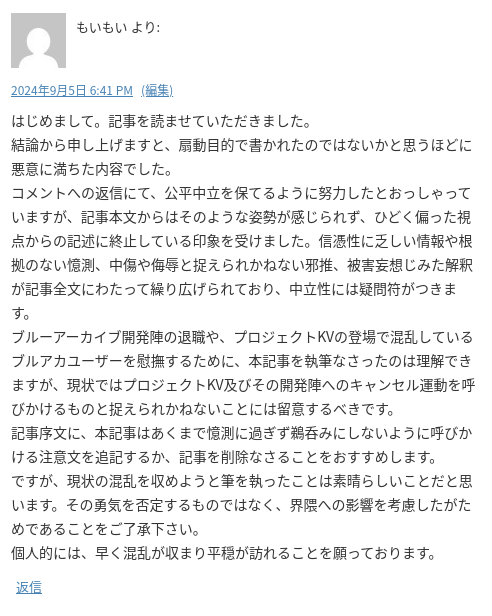 もいもいさんより、自分の記事が「公平性に欠け悪意に満ちた内容」と批判をされまして、それに対して自分からも返信をさせていただいたんですが、1年以上経ったもののもいもいさんからの返事がいただけておりません!お返事待ってます!