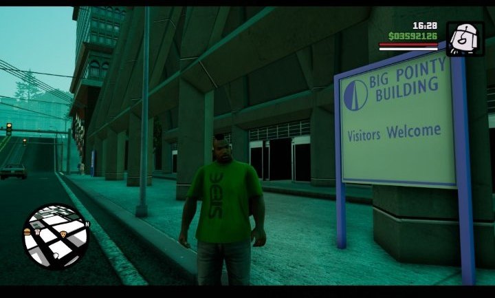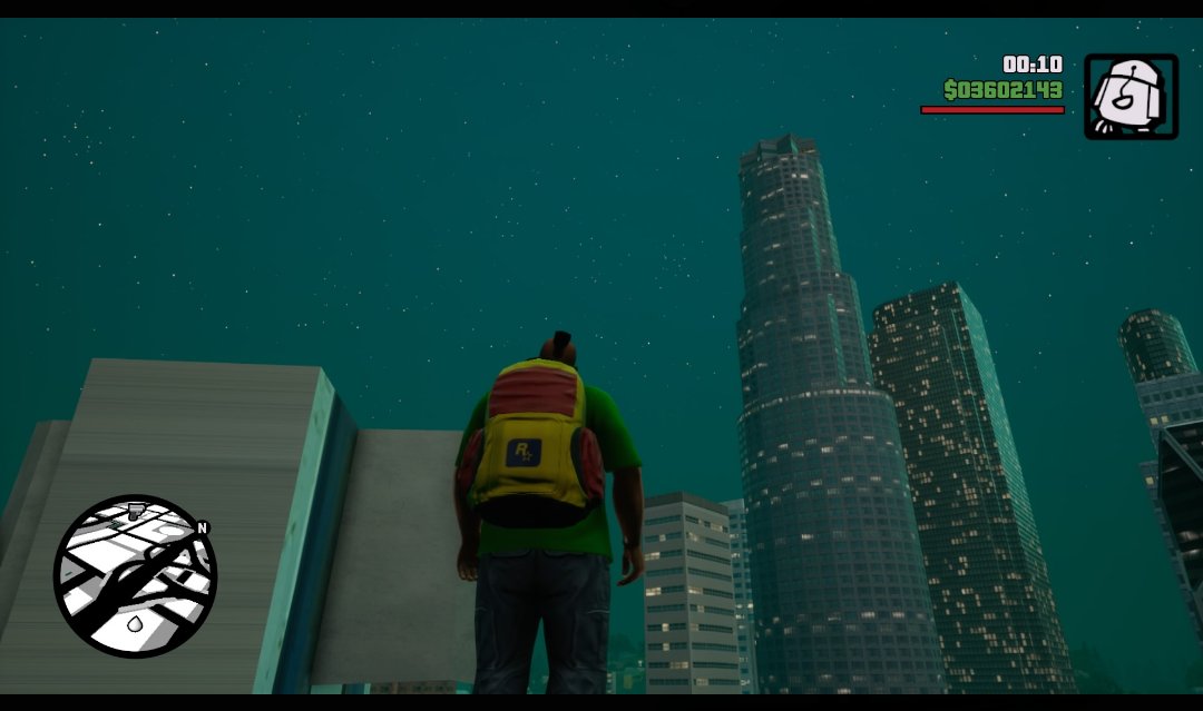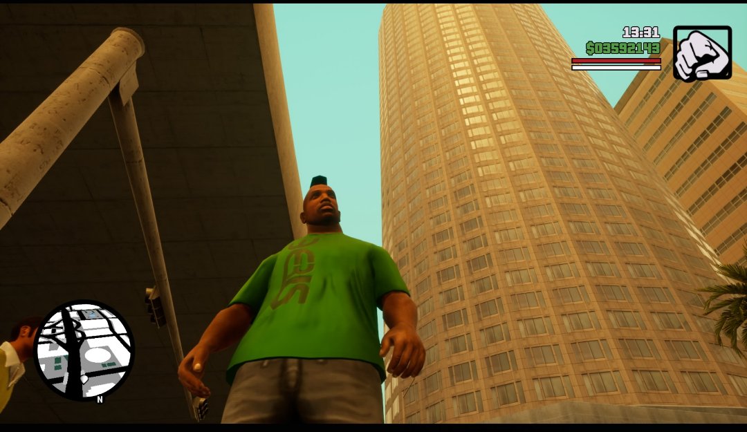こちらはロスサントスの都市部の中心、ダウンタウン。巨大建造物が立ち並ぶ大都市の中で、一際目立つ超高層ビルがこのロスサントスタワー(ゲーム中では特に名が付いていません)。こちらのビルはサンアンドレアス州で最も高い建物となっています。