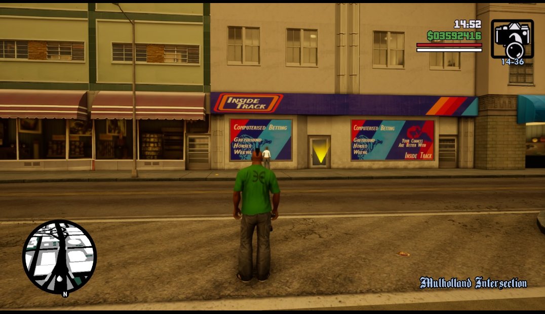 高速道路のジャンクションの真下、マルホランドに隠れているのがこちらの馬券売り場。元々ロスサントスの西側、特に北側はミッションで殆ど絡まなければ遊びで行くことも少ない場所なので、この馬券売り場に自力で気づいたプレイヤーは少ないでしょう。ミッションでこの辺に来ることなんて、プロローグの墓地から自転車で帰る「Big Smoke」と、スモークとライダーの裏切りに気づいて駐車場でバラスと戦う「Green Sabre」くらいですからね。