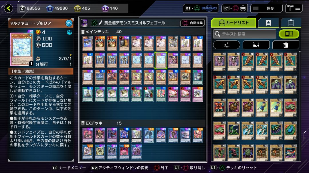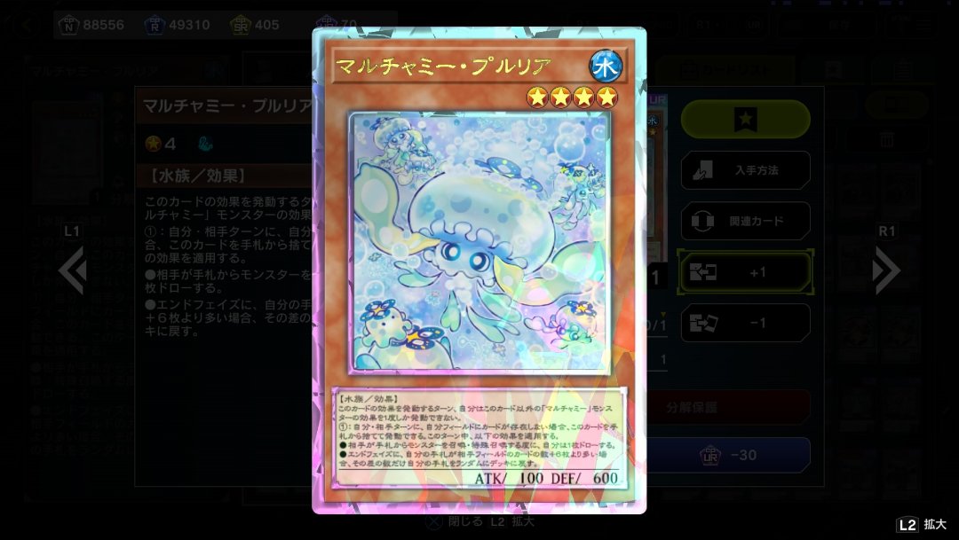 マルチャミーシリーズが去年実装され、マルチャミーシリーズが入ったパックの中身を見て「生成だけすればよくね?」と思った自分は、フワロスのみを生成。その後、フワロスがあれば十分と満足してゲームを続けていました。プルリアが効くライゼオルが到来した後も、「でもぉ、シングル戦でプルリア使いたくないしぃ」ともじもじしながらプルリアにクラフトポイントを使うのを躊躇っていました。だって、プルリアを生成するポイントで他のデッキ組めるじゃん……。
