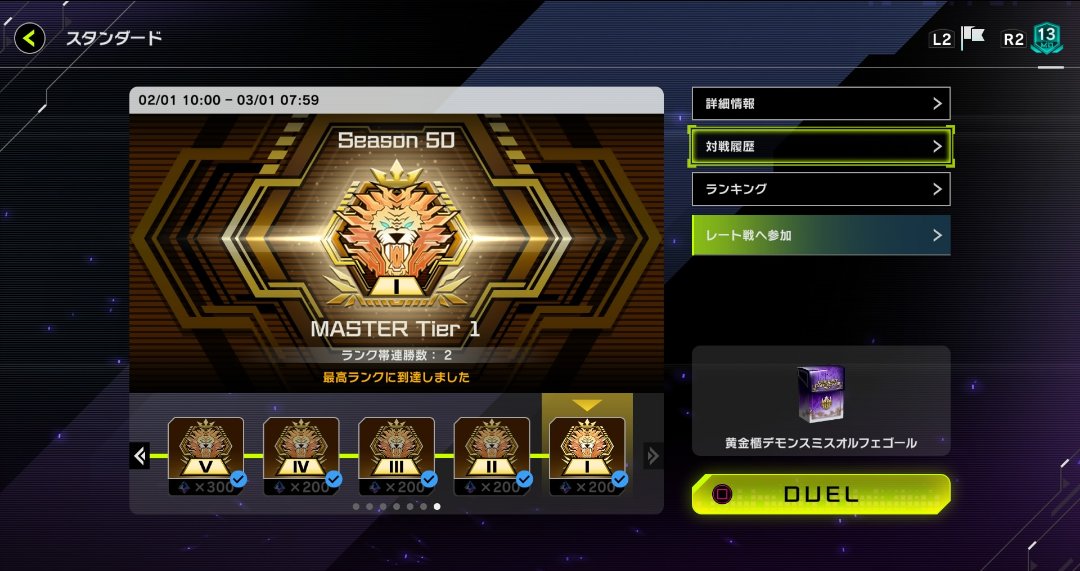 というわけで、本当に最後の最後でマスター1に登れてしまいました。“登れてしまった”というのが正直な感想ですね。こういう間に合わないはずのものが間に合っちゃうのは良くない成功体験です笑。とはいえ、偶然で勝ち続けられたわけではなく、ちゃんと手応えを感じた中で綱渡りのようなチャンスを拾っていって、負けた試合も構築に間違いがないと確信できる負け方をしていたので、期限がギリギリすぎる以外は良い戦いができたと感じました。