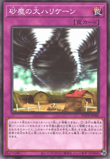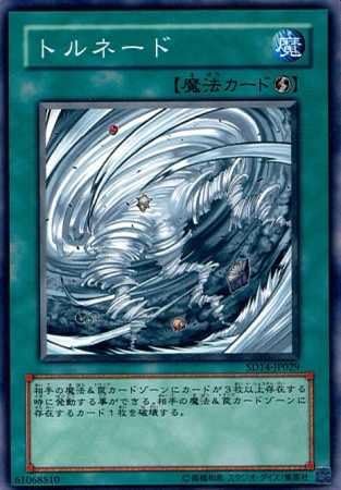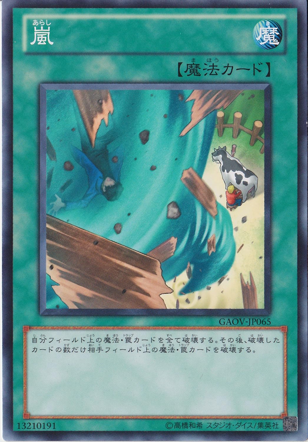 遊戯王において風を発生させるカードは魔法・罠を破壊するカードというイメージがついていて、その代表例に絢嵐でも中心となっている「サイクロン」なんかがあります。ただ、牛が飛ばされているのは嵐とハリケーンだけで、サイクロンやツイスターなどでは牛が飛ばされていません。同じ強風系カードでも、牛を飛ばすか飛ばさないか、コナミ的に基準があるのかもしれません。