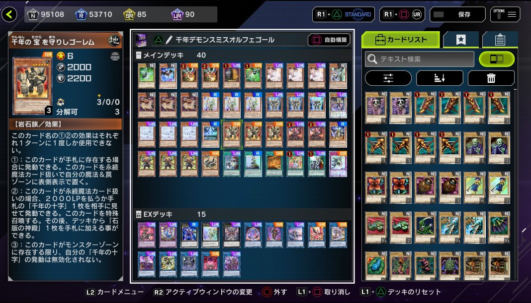 そんなこんなで色々試してみた中で、最終的に行き着いたのはやっぱりオルフェゴールでした。千年ゴーレムが無制限に解放されたので、以前愛用していた黄金櫃型から千年型にシフト。フルパワーの千年ギミックと、トロイメア・マーメイドとサロス=ナンナが全て使える、カツカレーラーメンの如き欲張りデッキです。なんで全部使えちゃうんだろうね。