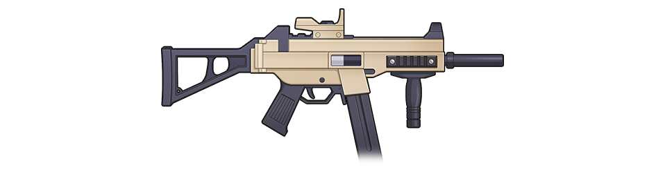 SRT特殊学園から支給された制式短機関銃。軽量で高い安定性を持ち、盾との併用が可能。他のサブマシンガンと比べて消音性が高いため、裏で敵を処理するのにも適している。